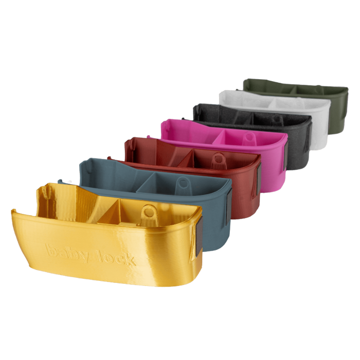 The Baby Lock New Style Trim Bin is the perfect accessory to keep your overlock and coverlock workspace clean and organized. Designed with convenience in mind, this trim bin collects fabric trimmings and threads as you sew, helping you maintain a tidy and efficient sewing area.