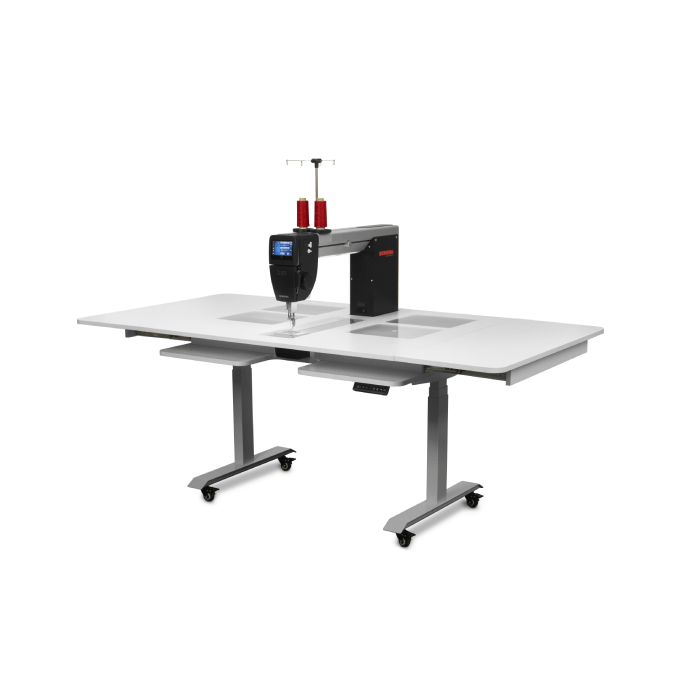 The Q Series Lift Table is a powered height-adjustable table with an integrated power strip. The working height is individually adjustable from 28 to 48 inches (72 to 121 cm) and can be saved in four different positions. The side leaves provide quilters the extra table space needed to quilt the largest quilt projects.