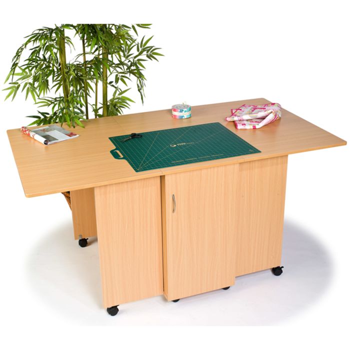 A table ideal for Cutting, Quilting, Sewing, in fact any hobby! Storage for both your sewing machine and an overlocker and is slim & mobile when closed.