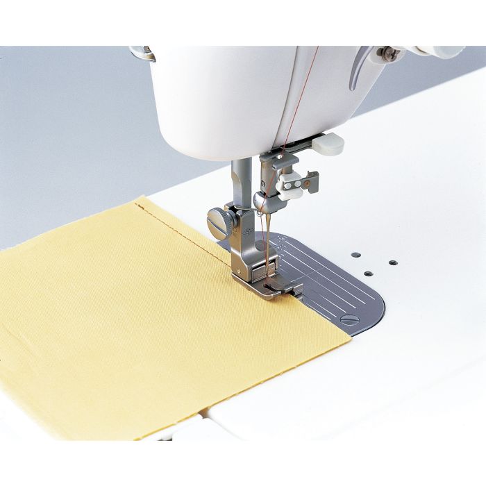 By guiding the fabric along the right toe (guide) of the presser foot, stitching can be sewn 0.03" (7mm) from the thick seam. Since a spring moves the guide up or down, this presser foot can be used with a variety of fabrics, from standard weight to heavyweight.