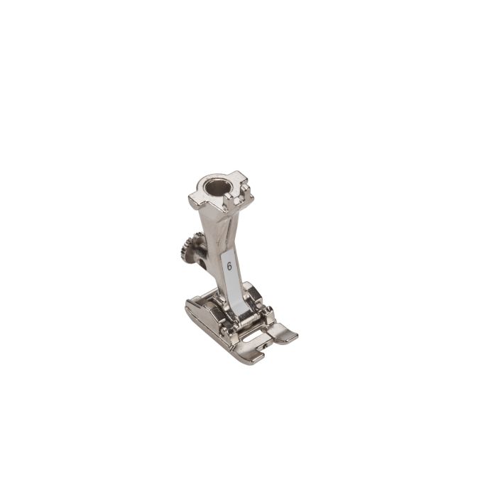 Embroidery foot #6 is ideal for satin stitching and other dense stitch patterns. The wide channel under the sole allows it to glide effortlessly over thicker and wider stitch formations without fabric feed being affected.