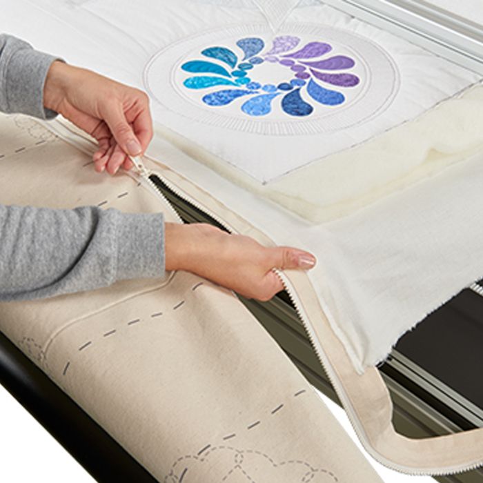 The BERNINA Zippered Leaders have many benefits for the quilter, especially when working on more than one quilting project at a time. Instead of pinning the backing and lower end of the quilt top directly to the leaders on the frame, the fabric is pinned or even machine basted to the respective smaller zippered parts of the leaders and then zipped onto the main part. This can be done in a comfortable sitting position. Additionally, the quilting project although unfinished, can be changed with ease zipping off one and bringing on another. The started project will remain square and can easily be put on the frame again with just a few steps.